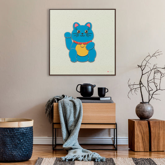 32x32" Framed Canvas: "Blue Maneki-Neko"