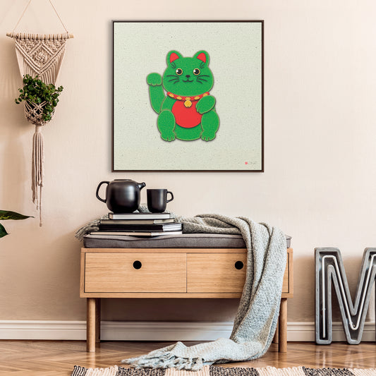 32x32" Framed Canvas: "Green Maneki-Neko"